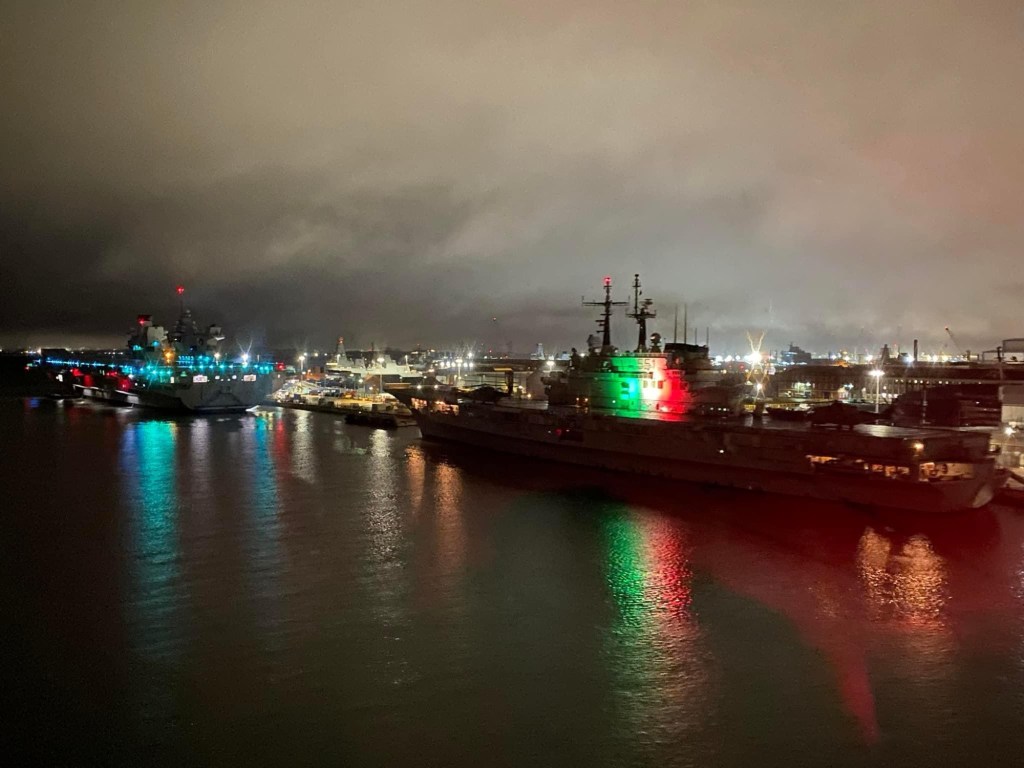 Italian aircraft carrier Giuseppe Garibaldi with patriotic illumination in Portsmouth dockyard